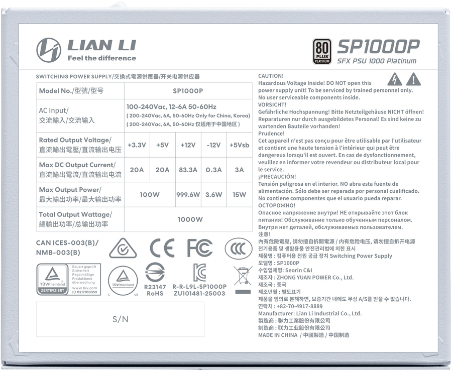 Lian Li SP1000P.W 1000 Watt 80+ Platinum Fully Modular SFX Power Supply White