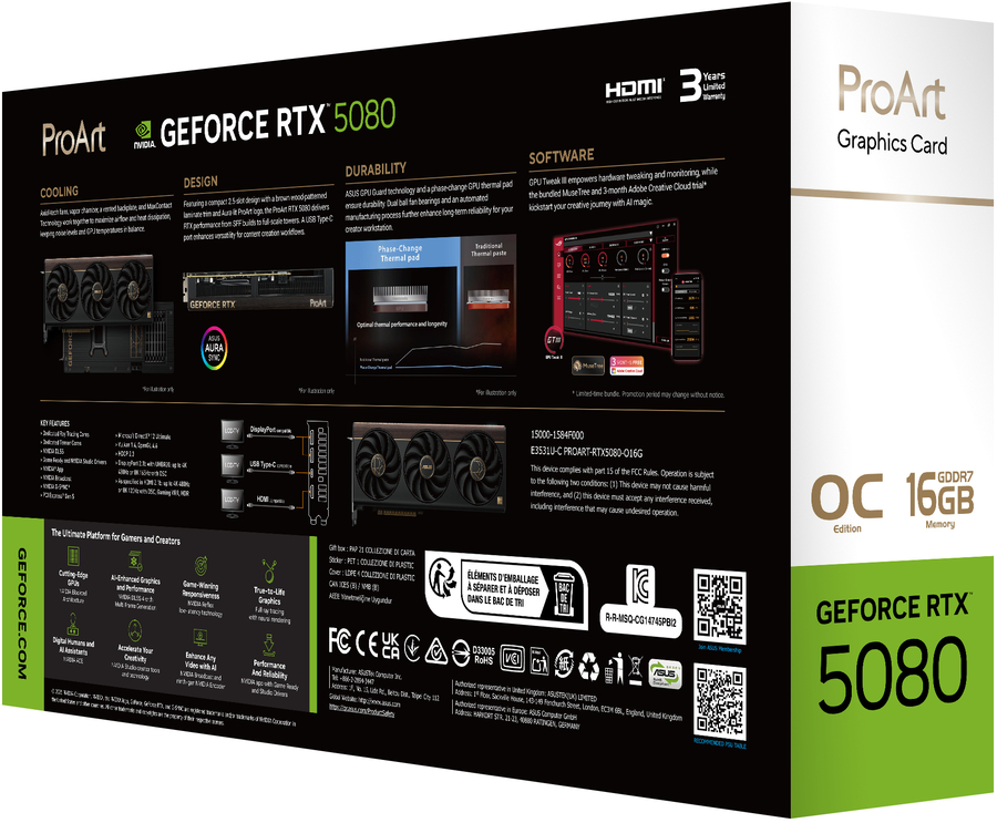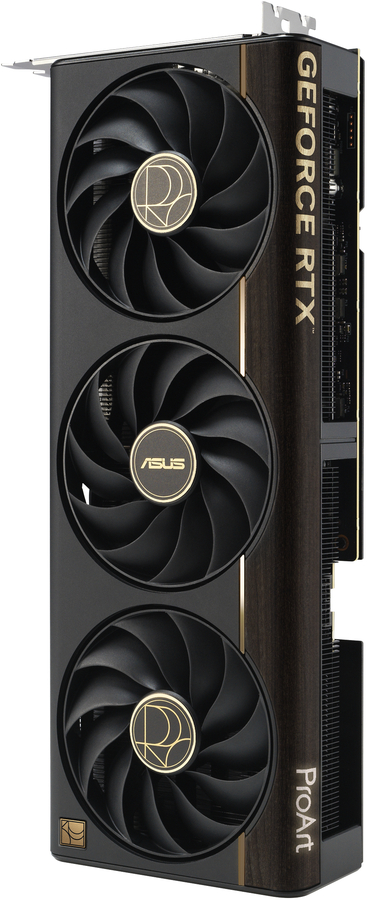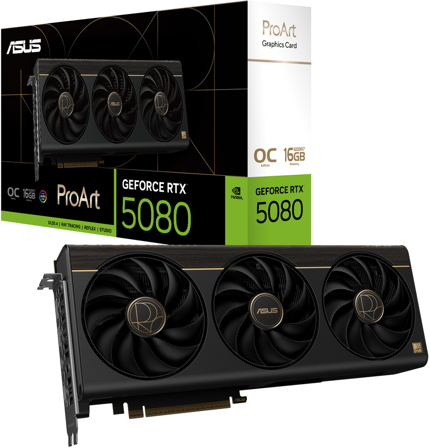 ProArt GeForce RTX™ 5080 Visionary. Versatile. Timeless. The ProArt GeForce RTX™ 5080 combines a compact 2.5-slot design with potent cooling – three Axial-tech fans, a vapor chamber, and a phase-change GPU thermal pad – to deliver GeForce RTX 50 Series performance to both full-scale towers and space-saving SFF builds. A USB Type-C® port enhances versatility for content creation workflows, while a wood-patterned laminate trim and low-key Aura-lit logo help deliver a refined aesthetic.