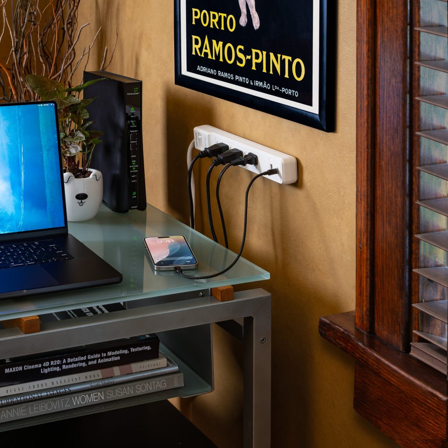 1.22m, 6x NEMA 5-15R, 45° NEMA 5-15P, 1500 J, 15A, USB-A, USB-C, 18W PD, White