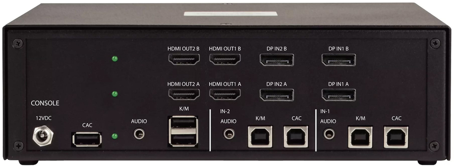 Manage two DisplayPort-enabled desktops, workstations, or servers from one mouse, keyboard, and four 4K 30Hz monitors. Status LEDs on the console ports, CAC port, and port selection indicators provide instant visual feedback, while NIAP certification ensures complete system isolation to prevent any data transfer or leakage between connected systems. Integrated anti-tamper switches provide protection from the moment the unit leaves the factory, so any intrusion attempt, whether in storage, transit, or operation, will permanently disable the KVM and trigger clear visual and audible alerts. This makes it ideal for safeguarding operations across security domains or ensuring compliance with strict regulatory requirements.