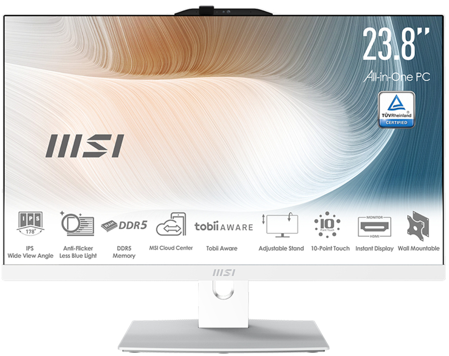 With a 23.8" FHD IPS Screen with eye-sensitive display technology and the latest Intel Core processor, the MSI Modern AM242TP 1M-1096US is an all-in-one touch-screen desktop system with a built-in webcam that supports Windows Hello and Tobii Aware software, DDR5 memory, adjustable stand, easy-to-access storage, and a broad array of connectivity options.