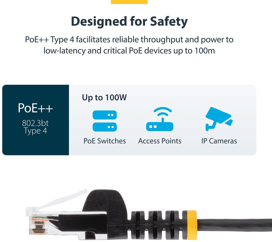 Each cable is individually tested using a Fluke® DSX2-8000 CableAnalyzer™ to meet ANSI/TIA-568.2-D Category 6 specifications, ensuring consistent signal integrity with minimal Near-End Crosstalk (NEXT) and Retun Loss (RL). Reliably deliver up to 100W of PoE++ to power a remote networking devices, including PoE switches and boardroom cameras. This Slim Cat6 Patch Cable complies with IEEE 802.3bt Type 4 PoE++ specifications. |