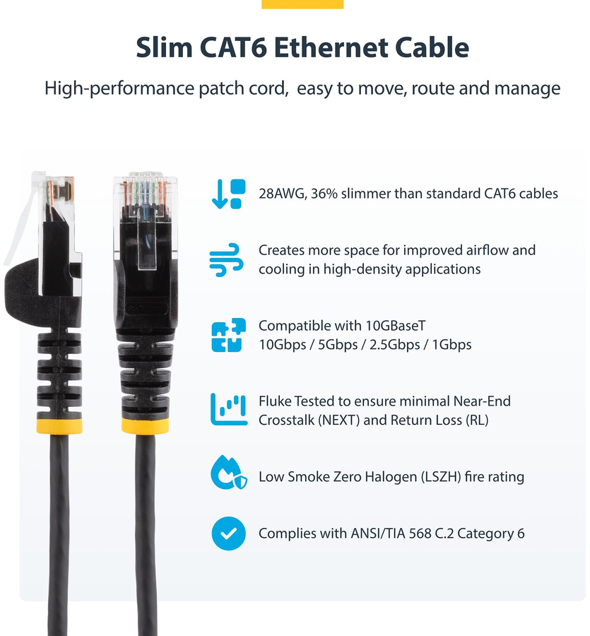 The Slim Cat6 Patch Cord is 36% thinner than standard Cat6 Ethernet cables, enabling greater airflow and heat dissipation in confined spaces. The Slim Cat6 Ethernet cable is also more flexible, for easier cable routing in crowded network racks and patch panels.