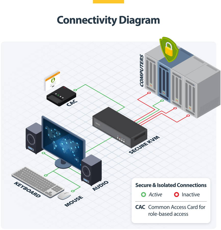 Operate multiple secure systems from a single workstation with the NIAP-Certified KVM switch, delivering uncompromising security, enterprise-grade performance, and seamless control over up to four computers with a 2560x1600 60Hz displays.