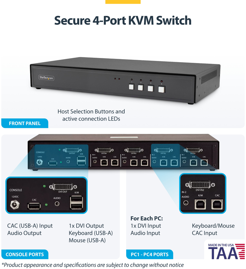 StarTech.com Secure 4-Port KVM Switch, DVI, NIAP 4.0, Metal Housing, CAC Port, Made in the USA