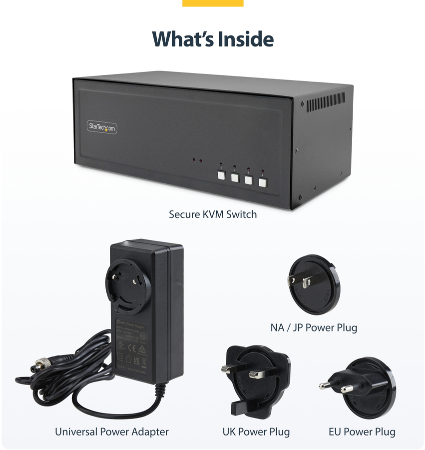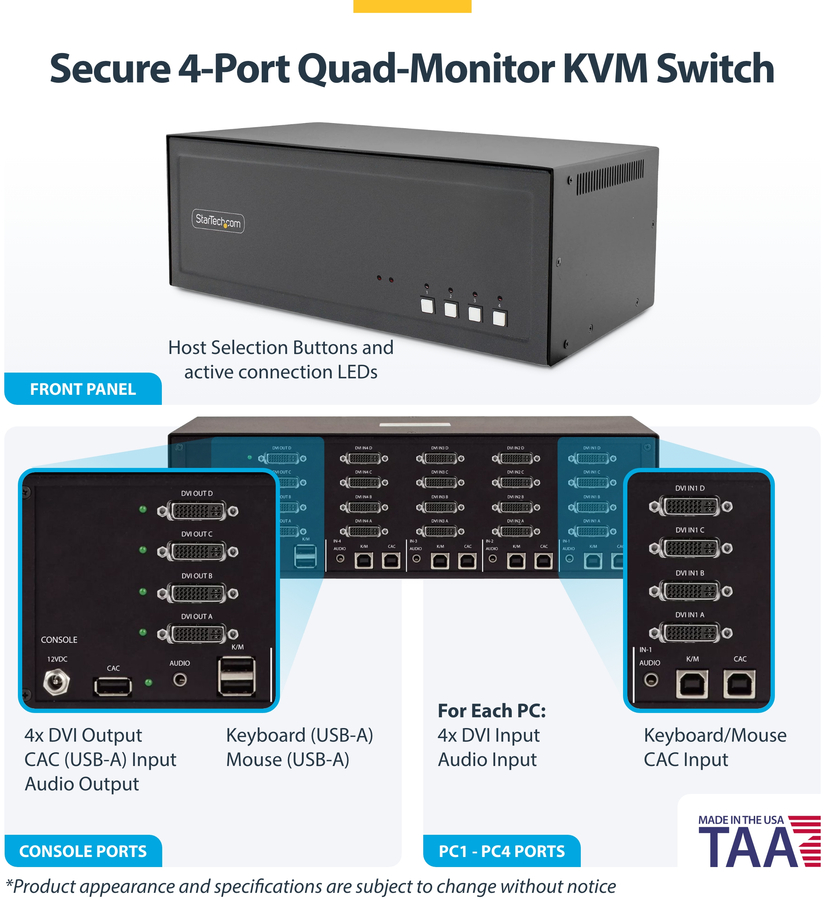 StarTech.com Secure 4-Port Quad-Monitor KVM Switch, DVI, NIAP 4.0, Metal Housing, CAC, Made in the USA
