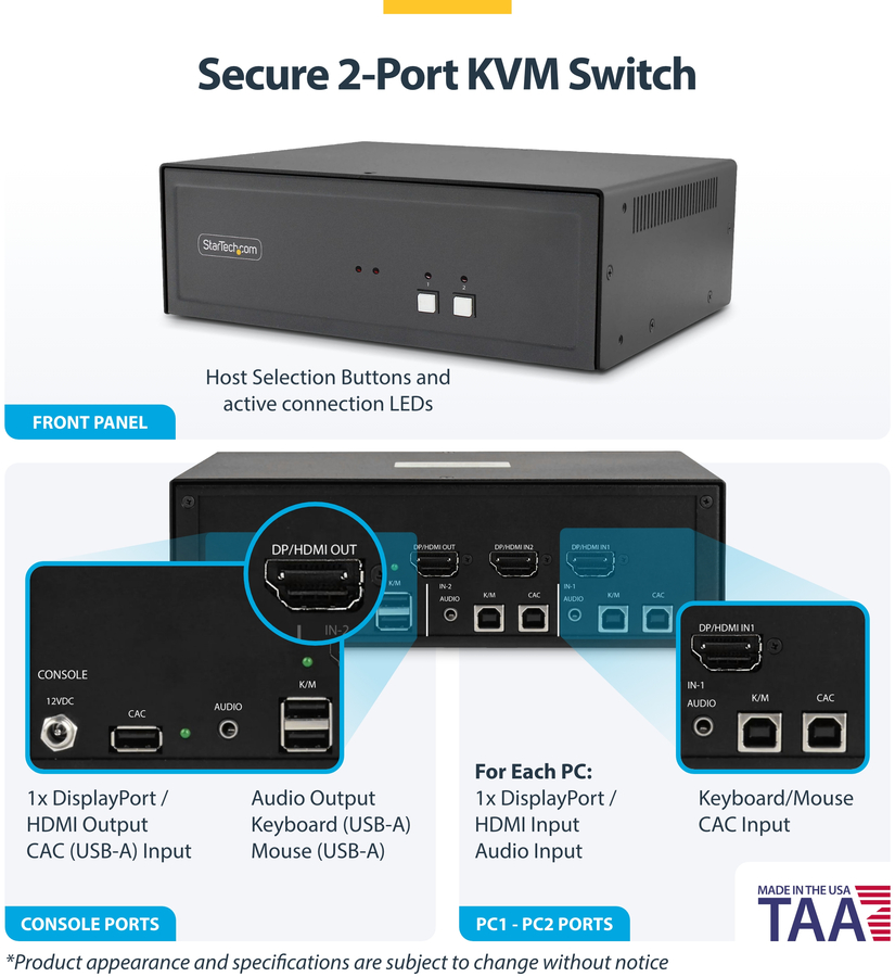 StarTech.com Secure 2-Port KVM Switch, HDMI or DP, 4K 60Hz, NIAP 4.0, Made in the USA