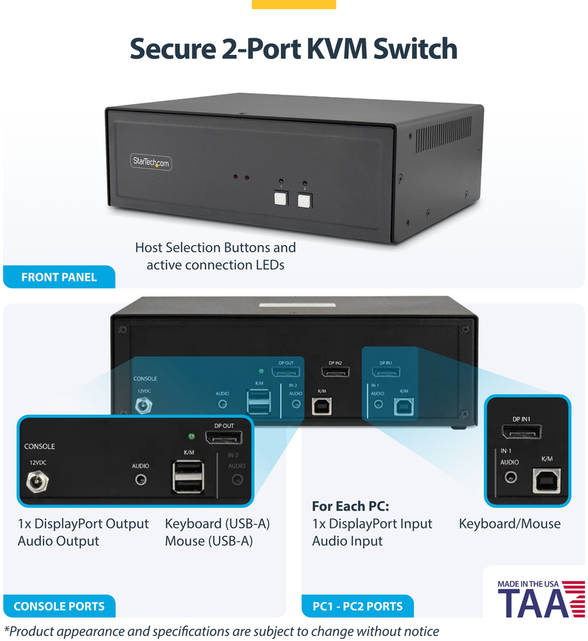 StarTech.com Secure 2-Port KVM Switch, DisplayPort, 4K 30Hz, NIAP 4.0 Desktop KVM, Metal Housing, Made in the USA
