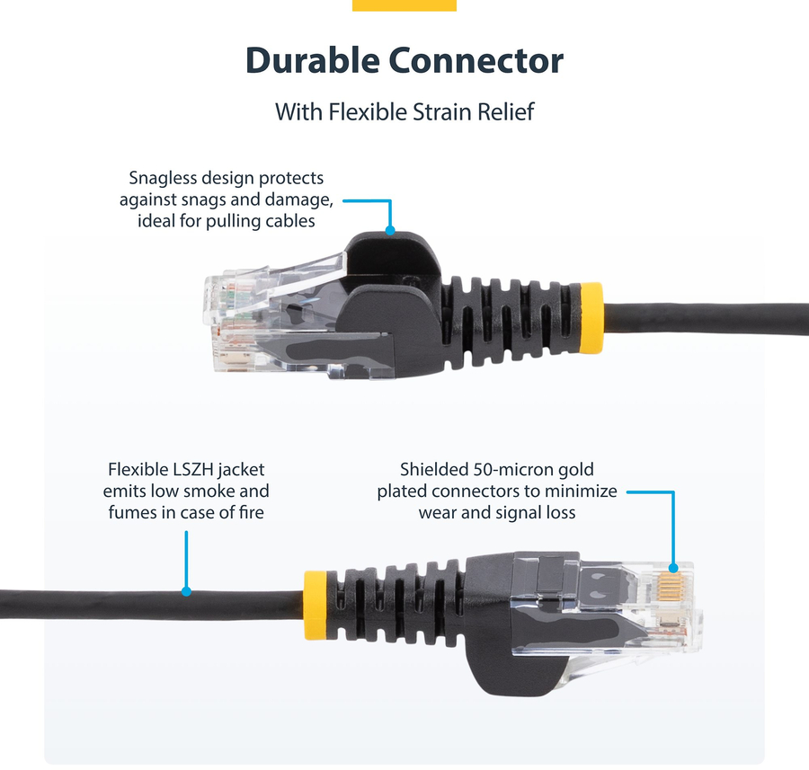 This cable features snagless connectors that protect the RJ45 clips during installation, reducing snags or breakage when routing through narrow gaps or in between devices.