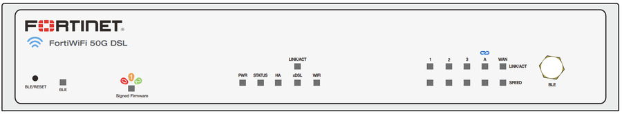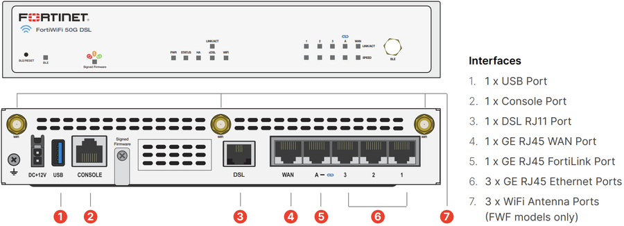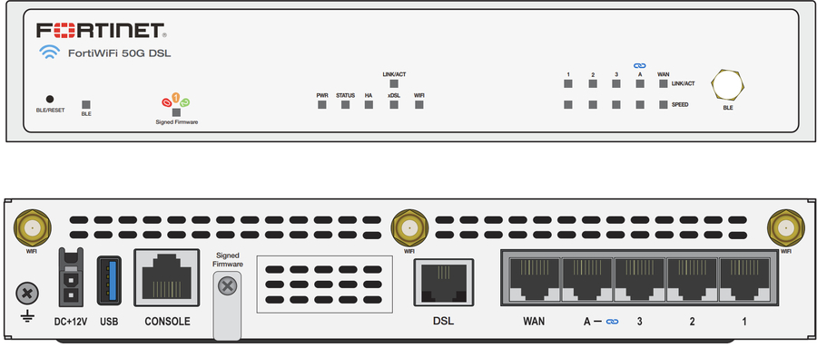 FortiWiFi 50G-DSL, Region Code - A, 1 WAN, 3x RJ-45, 1x RJ-45 FortiLink, 1x RJ-45 Console, RJ-11, USB, WLAN, Bluetooth BLE, 42 x 216 x 178 mm + 1 Year FortiCare Premium and FortiGuard Unified Threat Protection (UTP)