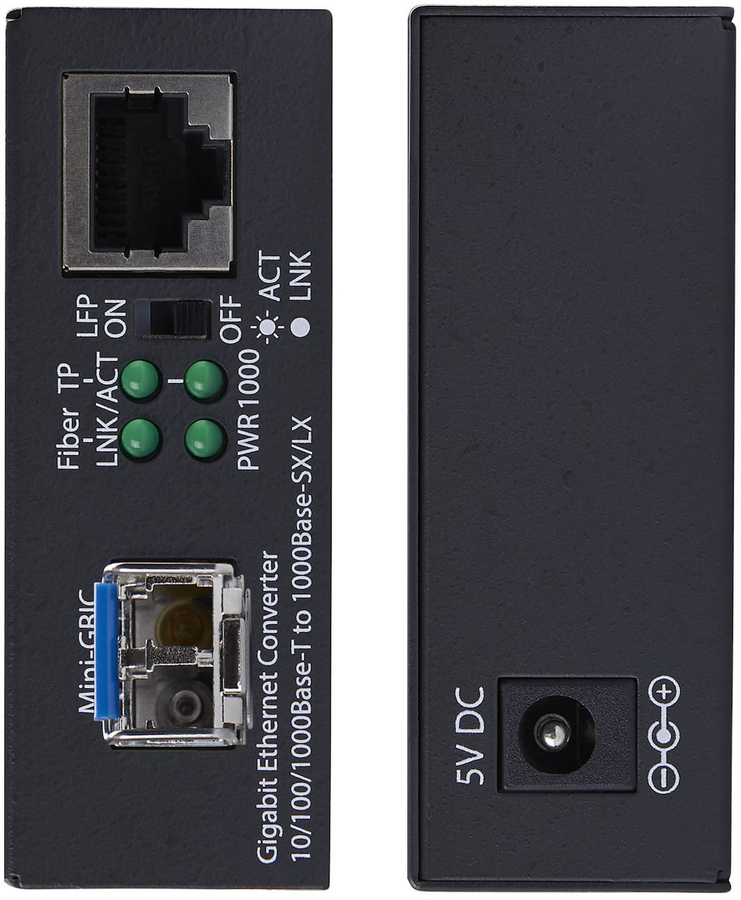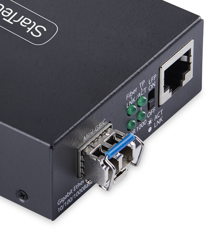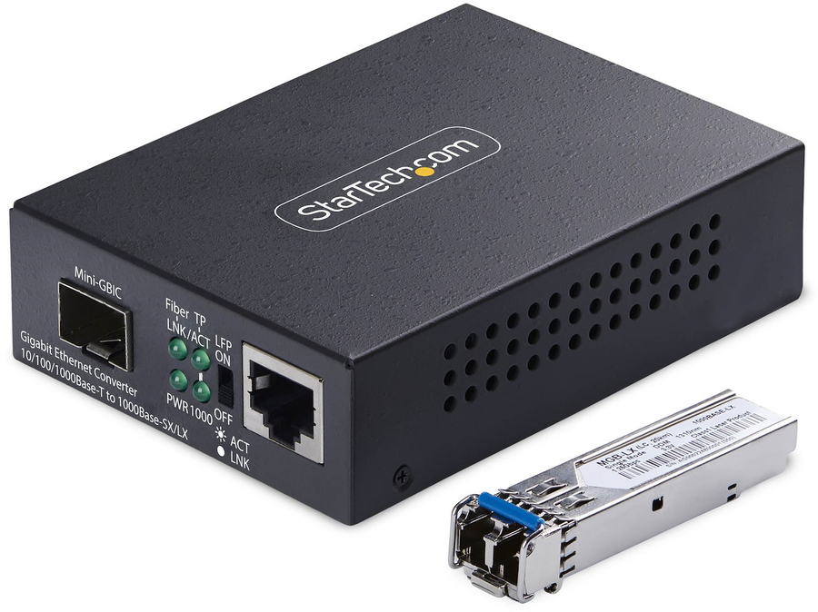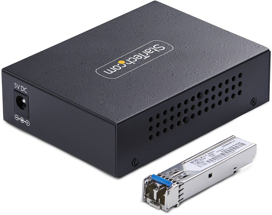 Convert and extend a Gigabit Ethernet connection up to 20km (12.4 miles) using single-mode LC fiber cable.