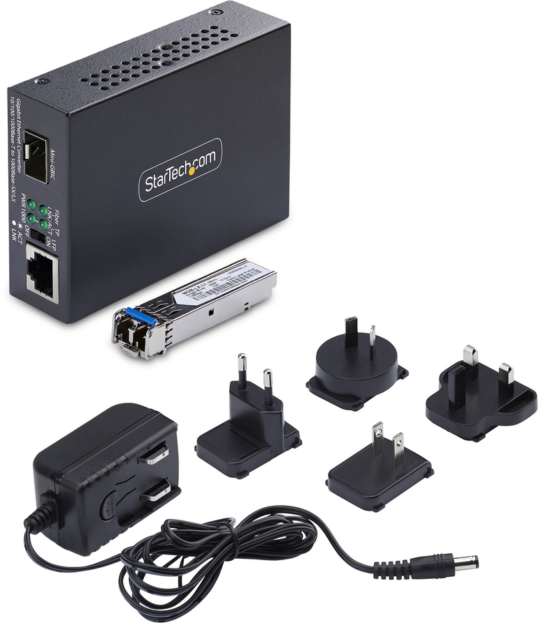 Deploy in minutes with plug-and-play setup and multiple mounting options including wall-mount, DIN-rail, or media chassis installation. It includes a 5V DC, 2A power adapter, making it ideal for server rooms or network closets. |