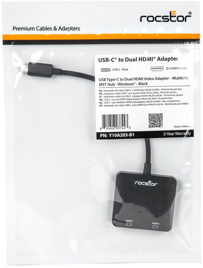 USB-C to Dual HDMI® Adapter Splitter- 4K/60Hz – Black, This Rocstor Premium Adapter allows you to add two 4K HDMI™ monitors to your HP, Lenovo & Dell™ Precision, Dell™ XPS, Notebook, Chromebook® or any other PC Windows PC through a single USB-C or a Thunderbolt™ 3/4 port. Rocstor’s innovative Dual HDMI 4K adapter supports mirror images and extended images. That means you can display the same content on two monitors or different contents on two monitors, both at 4K resolutions. This adapter supports Mac computers with the same picture under SST mode. With this Rocstor Dual HDMI adapter, you can work more effectively and efficiently from your laptop as you can simply connect your laptop directly to two monitors with HDMI connection. Each display allows you to receive a clear and crisp image up to 4K ultra-high definition @ 60Hz. The Multi-Stream Transport (MST) Hub allows you to connect two HDMI monitors to your host computer’s USB-C port, also making it a perfect choice for delivering professional quality presentations at workstations. With this USB-C port, you do not need any additional power adapters, and the MST features are fully compatible with computer models such as HP, Lenovo, Dell Precision™ and Dell XPS™ laptops. Rocstor delivers the highest quality adapters and functionality. The Rocstor Dual HDMI adapter does not require any drivers or additional power source. It is built for PC computers running Windows 7, 8, 10, or 11 operating systems. Simply connect your adapter to your host computer’s USB-C or Thunderbolt™ 3 port and enjoy resolutions of up to 3840×2160 @60Hz on two HDMI connected Displays. Each monitor is able to display a clear 2K or 4K image at 60Hz. This multi-monitor MST hub adapter is backed by Rocstor’s 3-year warranty and lifetime phone support. |