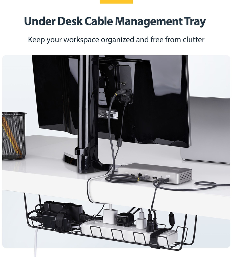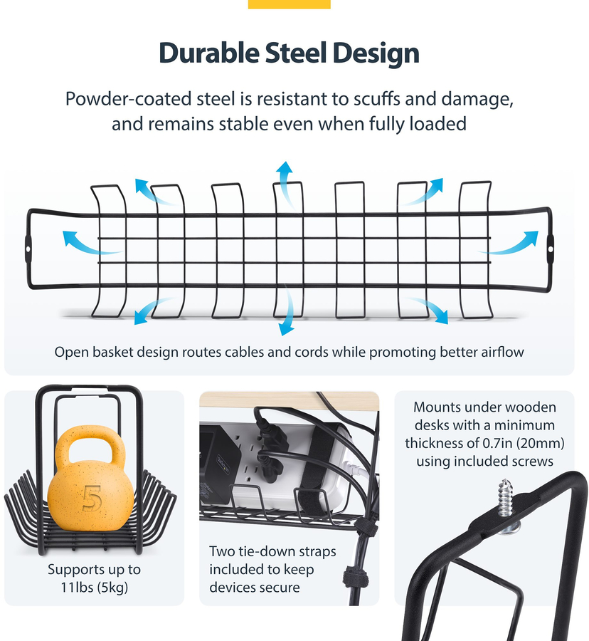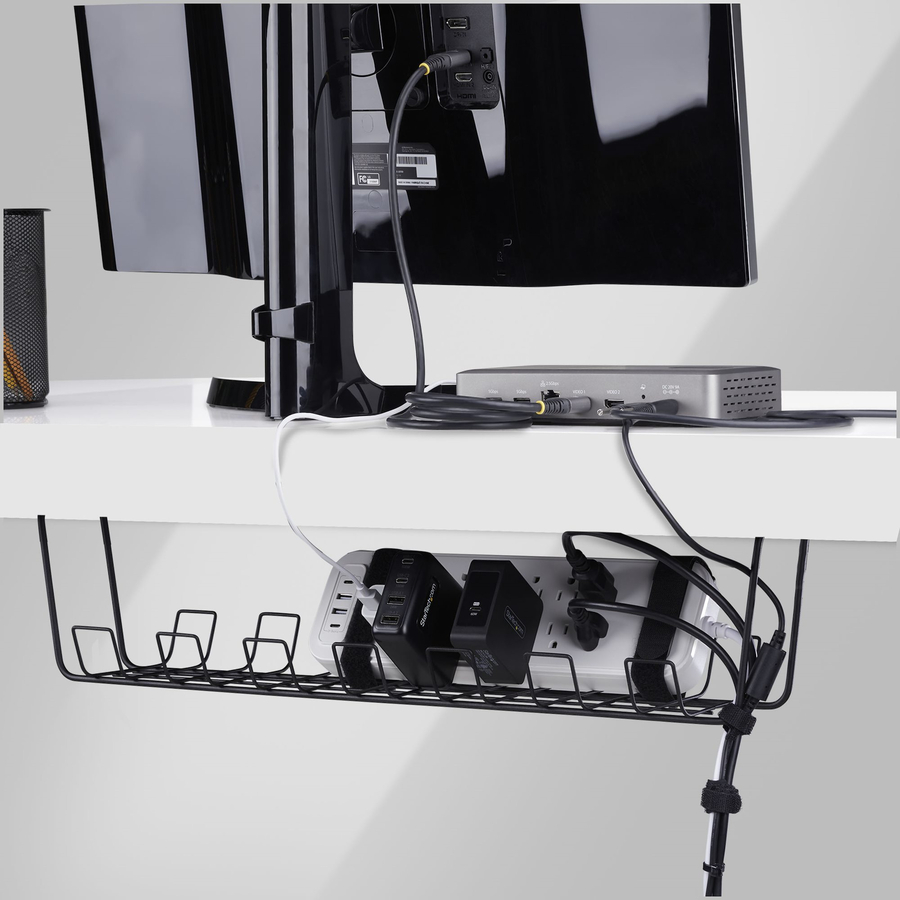 StarTech Under Desk Cable Management Tray, 24" Long, Metal Basket Style Cable Organizer, Screw-On Installation, Power Bar Holder, Metal, Black, TAA