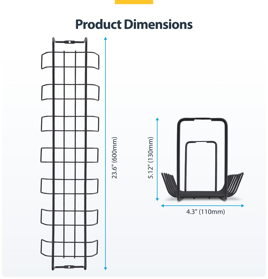 Maintain a clean, organized workspace and reduce the risk of tripping hazards or tangled cords with this 24in (615mm) long under-desk cable management tray. Each tray is 5.2in (132.5mm) wide and 5in (130mm) deep to accommodate larger power bars and strips.