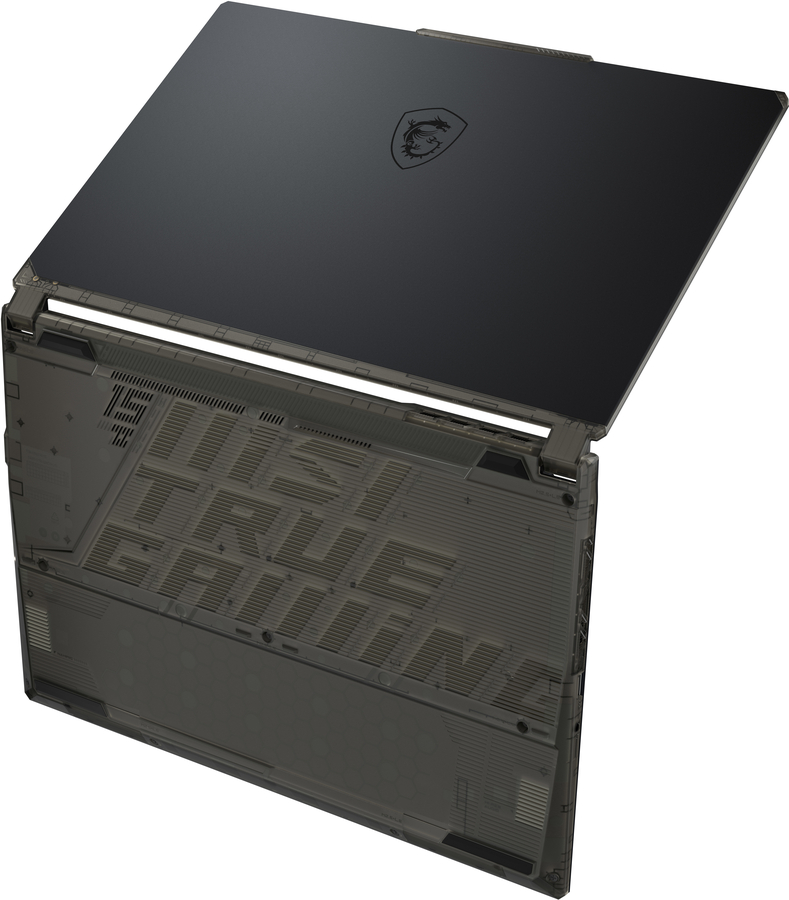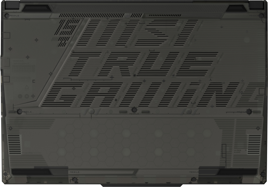 CYBER-ENHANCEMENT-LIKE BOTTOM Geometric lines and shapes are drawn underneath the bottom plate, symbolizing modifications on cyborgs from Sci-Fi works, along with stylized texts hidden in the ventilation openings conveying MSI's gaming spirits.