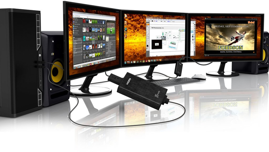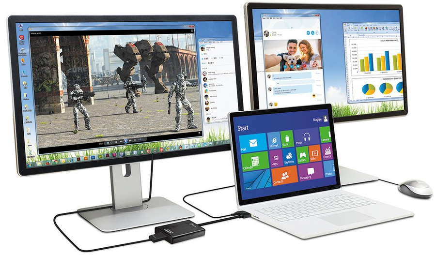 Looking for an easy way to add a second monitor? Let's get to multitasking! The JUA350 USB 3.0 Display Adapter works as an external video card, instantly allowing users to attach additional displays via an HDMI connection without the hassle of a lengthy setup or having to install additional internal hardware. The adapter can support up to four displays running on the same computer, turning your workstation into a fully-functioning multi-display powerhouse. You can have your second monitor with an extended display, a mirrored display, a rotational display (rotation mode not available for Mac), or make it your primary monitor. |