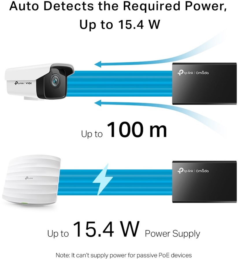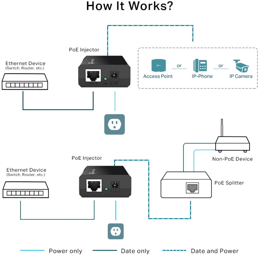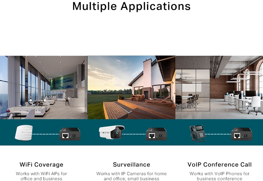 The PoE Injector POE150S (TL-POE150S) fully complies with IEEE 802.3af standard, and can work with all IEEE 802.3af PoE compliant PDs (Powered Devices) or PoE Receiver Adapters, such as TP-LINK’s POE10R, or other equivalent product, to expand your network to where there are no power line or outlet, where you wish to fix device such as AP, IP Camera or IP Phone, etc. |