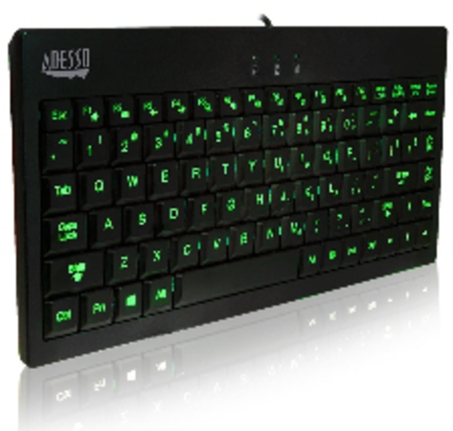 The Adesso® AKB-110EB 3-Color Illuminated Mini Keyboard is perfect for those who find themselves working late at night in dim or dark lighting environments. This keyboard features Illuminated backlit keys in 3 colors- Green, Blue and Red which can be accessed quickly and conveniently with a touch of a button. Dim, brighten, turn on, or turn off your backlit keys easily using hotkeys! Measuring less than 12” wide, it is also ideal for POS stations, sales, information kiosks, warehouses, or any small working environment.The The Adesso® AKB-110EB 3-Color Illuminated Mini Keyboard is designed with membrane key switches that provide a quieter and faster typing response and stands up to long-term usage! Illuminated Backlit Keys The Illuminated Backlit Keyboard allows you to work day and night, while easing eyestrain and helping you see the correct keys in any lighting environment. Work at your desk, study, or in the bedroom without disturbing others from dusk til dawn, or anytime inbetween! For business, the small footprint keyboard is perfect in dimly light showrooms, warehouses, or offices. 2X Size Large Print Keys Large 2X bright white letters provide excellent contrast over tradional keyboards that have small white letters on black keys. Compact Size This keyboard is only 11.75" wide and is designed with a Windows Key layout that includes an embedded numeric keypad. This keyboard is a great space saver for your home or office. This keyboard is ideal for use in POS stations, sales, or information kiosks, warehouses, manufacturing environments or anywhere space is limited. Internet & Multimedia Keys Get instant access to your commonly used Internet and multimedia tools with the 20 built-in hotkeys this keyboard has to offer. Quiet Membrane Key Switches Membrane key switches provide a better tactile response and a quieter typing experience. Plus they last up to five million keystrokes. |