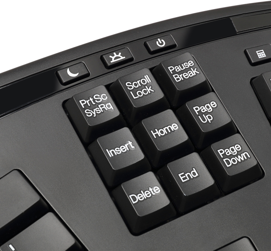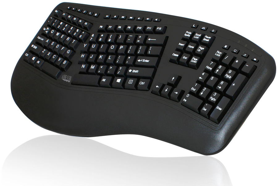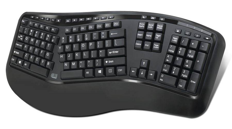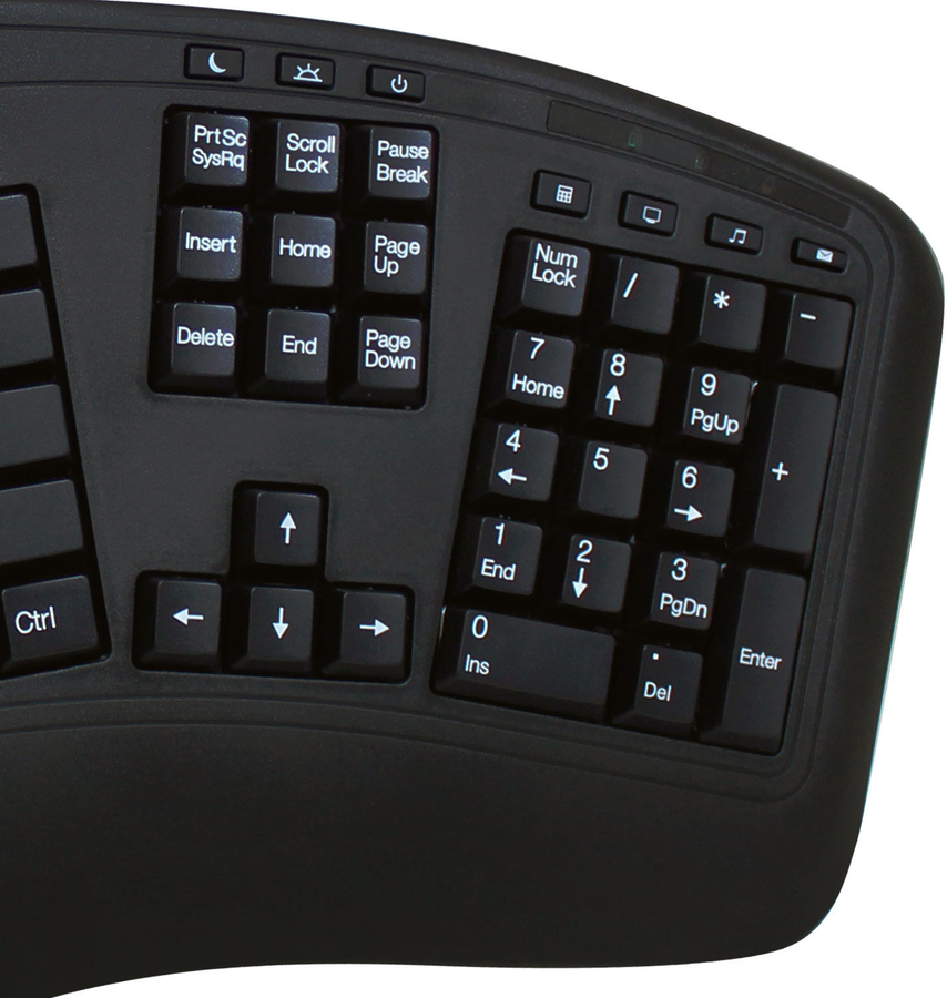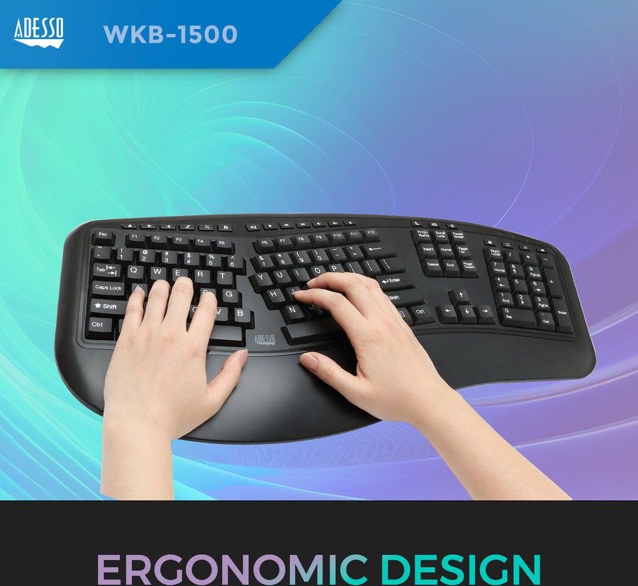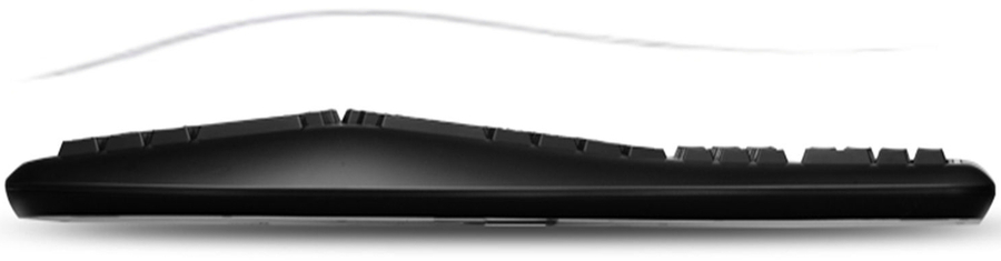 Ergonomic Design The design of this keyboard with splitted key zones and gently sloped shape encourages natural position of hands, wrists, and forearm in maximum comfort for long use.